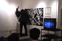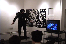 site: Morgan Building, University of Pennsylvania date: 2001 narrative: The installation included video of birds and recorded fake bird sounds made by people. The "birdcatcher" fed an imaginary bird. He slowly became frustrated by the process and turned to force-feeding and aggression toward the audience. I had just visited Chile and Latvia that past year. In each country I learned how a dictatorship (Chile) and communism (Latvia) controlled and manipulated an entire population. The "birdcatcher's" performance was my reaction to that experience. |