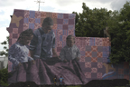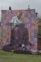 Donald Gensler, Jane Golden, U. Penn. Students, ArtWorks! Students, and Urban Tree Connection, Holding Grandmother's Quilt, 40' x 50' and 40' x 35', Sponsored by DHS and Ford Foundation, 2004. This project involved a unique group of niehborhood men called MASCO. Their organization has continued to maintain the park space in between the two murals. The quilt comes off of one wall into the lanscape and back onto the other wall. |