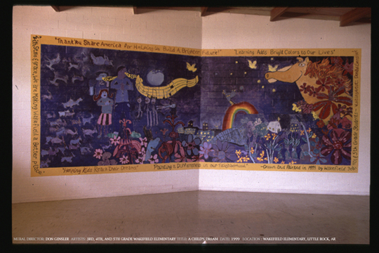 In a Child's Dream, 15' x 25', acrylic latex mural, Wakefield Elementary 4th 5th and 6th Grade, Arkansas Arts Center New Futures Grant, Little Rock, AR, 1999. With a new playground being built at the school, I had students think about play and dreams. The images which they drew were then assembled and transferred on the schools cafeteria wall. Over 200 students designed, drew and painted the mural. |