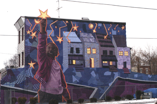 Donald Gensler, Jane Golden, U. Penn. Students, ArtWorks! Students, Reaching For Your Star, 35'x 60', acrylic mural, Sponsored by DHS, Zach Oppenheimer, 2003. This project was part of a city-wide Anti-Truancy program that seeks to work with children and their communities. The Penn Students worked with some of these kids during the project. A neighborhood playground was revitalized and another smaller mural painted as components of this project. |