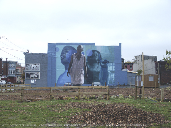 Songs of Hope, 40' x 80', acrylic mural, 34th and Haverford St., Sponsored by AT&T Wireless, 2002. The images came out of discussions and time spent at the church on which the mural stands, Gate to Heaven Ministries. They use song as way to uplift and nurture the spirit within us. |