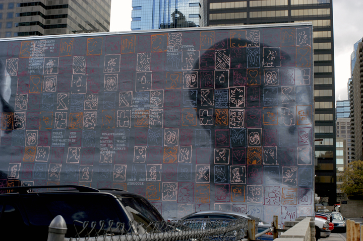 Symbols of Change, 35' x 128', acrylic mural on non-woven media, 21st and Market St., Sponsored by the Philadelphia Department of Human Services, 2004. Gensler worked with over 100 truant teenagers throughout Philadelphia to design symbols that represented their lives or where they would like their lives to be. Some of these students participated in roundtable discussions with judges, police, school administrators, social workers and parents to discuss the issue of truancy in their city. |